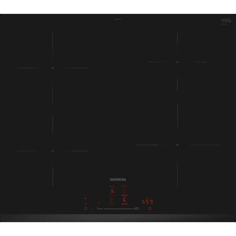 60см, 4 индукционных конфорки, Home Connect, взаимодействие варочной панели и вытяжки, управление сенсорное слайдер, 17 уровней мощности, таймер с функцией отключения по истечении заданного времени, без рамки, скошена по переднему краю, цвет черный, пр-во Испания