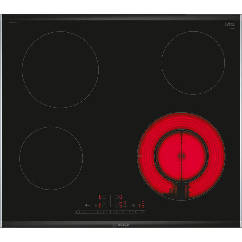 60см, электро, стеклокерамика, 4 зоны нагрева (1 с расширением), 17 ступеней мощности, сенсорное управление, скошенные края и металлический кант по бокам, цвет черный, пр-во Германия