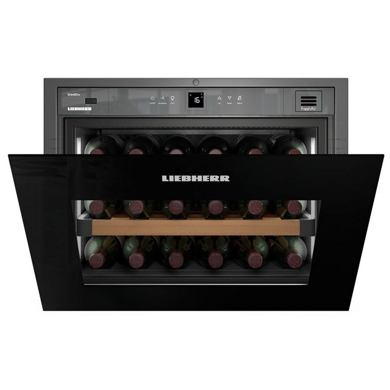 винотека, А+, 18 бутылки, 48л, (В*Ш*Г) 450x560x550мм, поддерживаемая темп. 5-20 градусов, 1 темп. зона, эл.управление, дерев.полки, дверца открывается вперед, как у духовки, индикация температуры, цвет черный, пр-во Австрия
